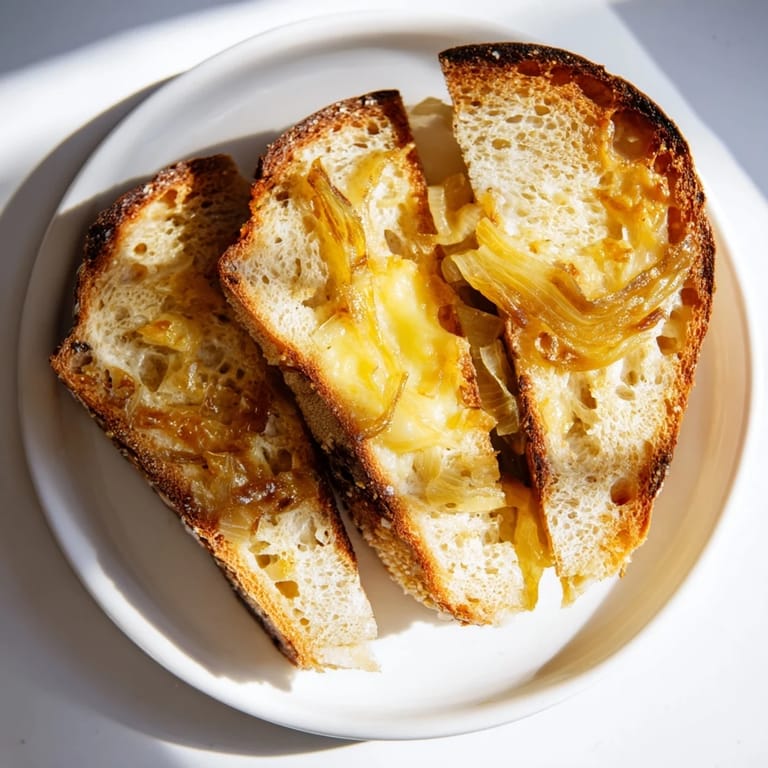 This sandwich is rich enough to be a complete meal, but I've found it pairs beautifully with something sharp and simple on the side—a quick green salad with a vinegary dressing cuts through the butter and cheese perfectly, or a bowl of tomato soup if you want to lean into comfort. Some people add a thin layer of ham between the cheese and onions for something heartier, and fresh thyme leaves stirred into the onions at the very end add an herbal note that feels almost French bistro. The beauty of this recipe is that it's forgiving enough for experimentation once you've made it the classic way at least once.