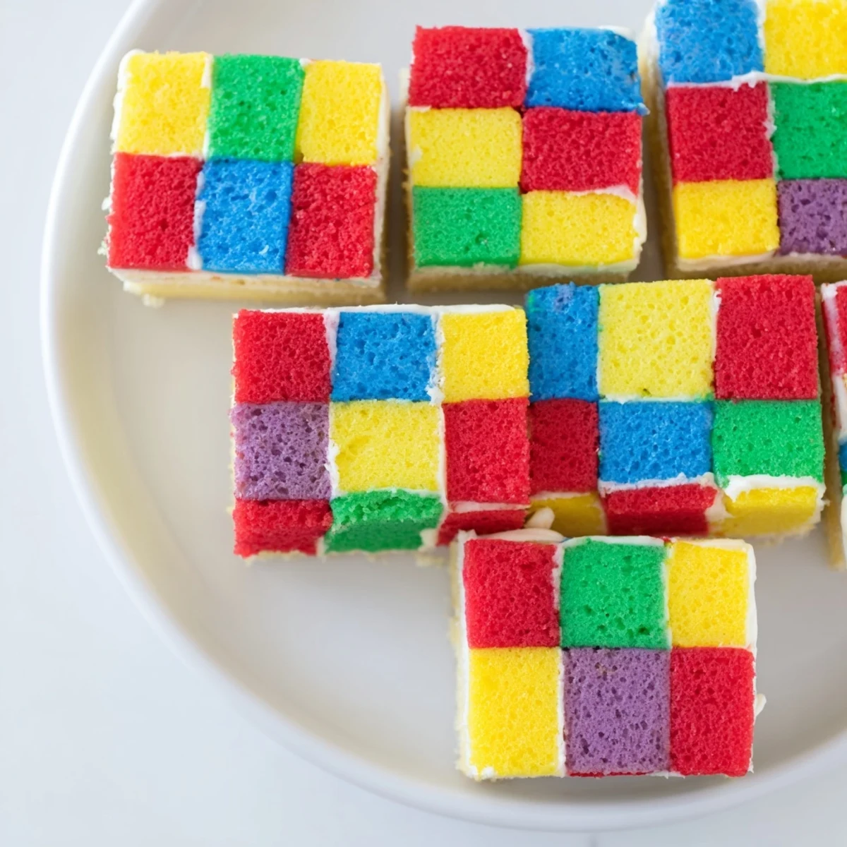 - Once the cakes are completely cool, carefully trim the edges to make them even. Then, using a sharp serrated knife, slice each colored sponge into uniform 3 x 3 cm squares. You'll need to be patient and precise here—measure with a ruler if you must. The uniformity is what makes the patchwork magic work.