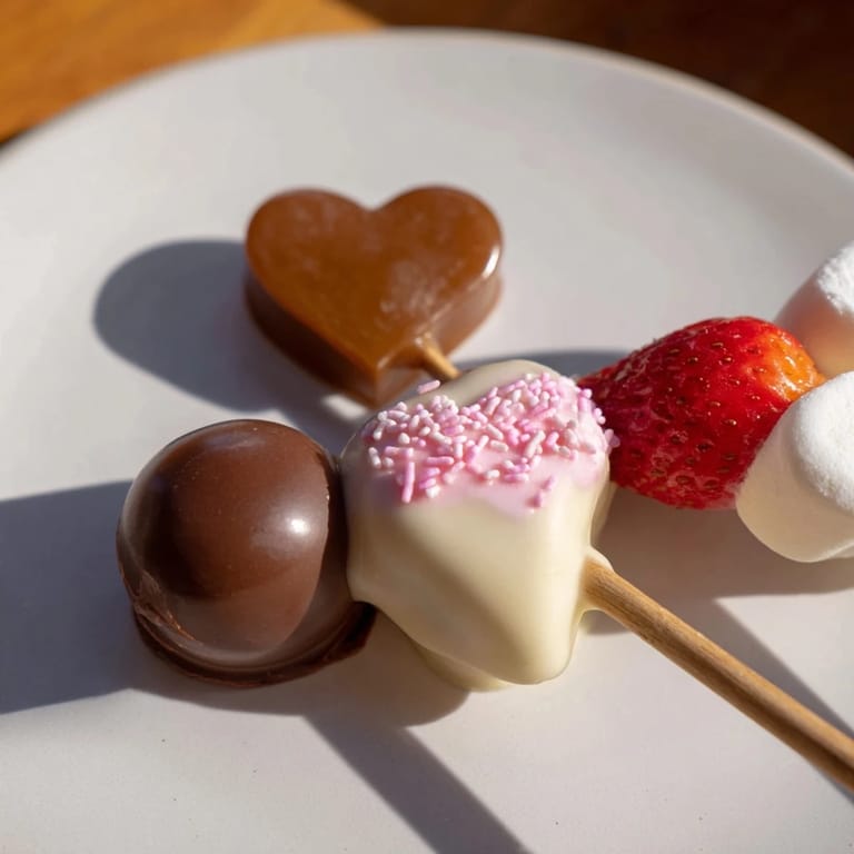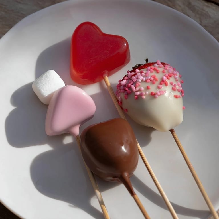 Pin A festive and playful candy assortment featuring heart-shaped treats and chocolate-dipped strawberries, perfect for Valentines Day or romantic celebrations.