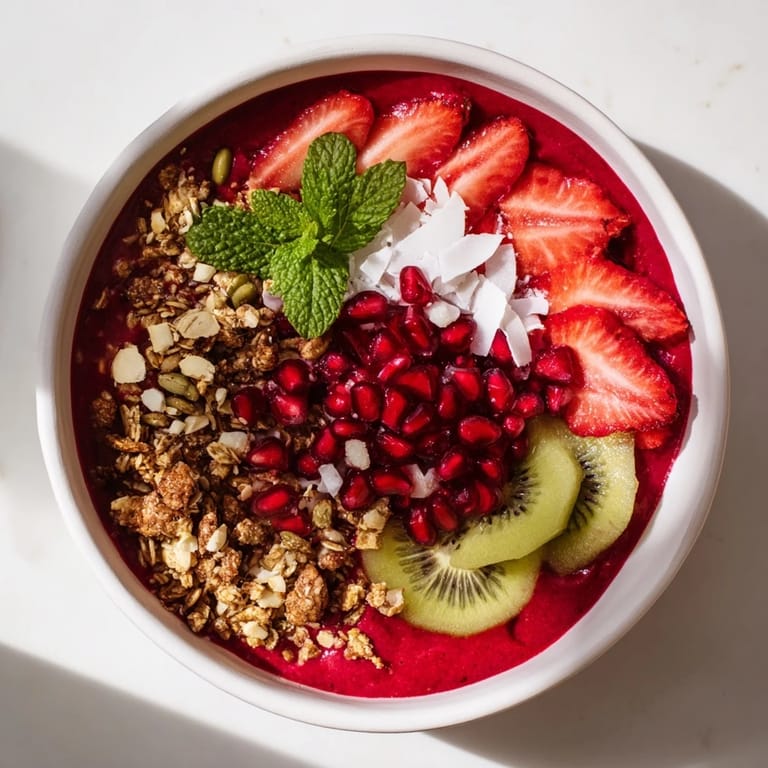 - Toppings: 1/2 cup granola (gluten-free if needed), 1/4 cup fresh pomegranate seeds, 1/2 kiwi sliced, 1/4 cup sliced strawberries, 2 tablespoons shredded coconut, Fresh mint leaves (optional)