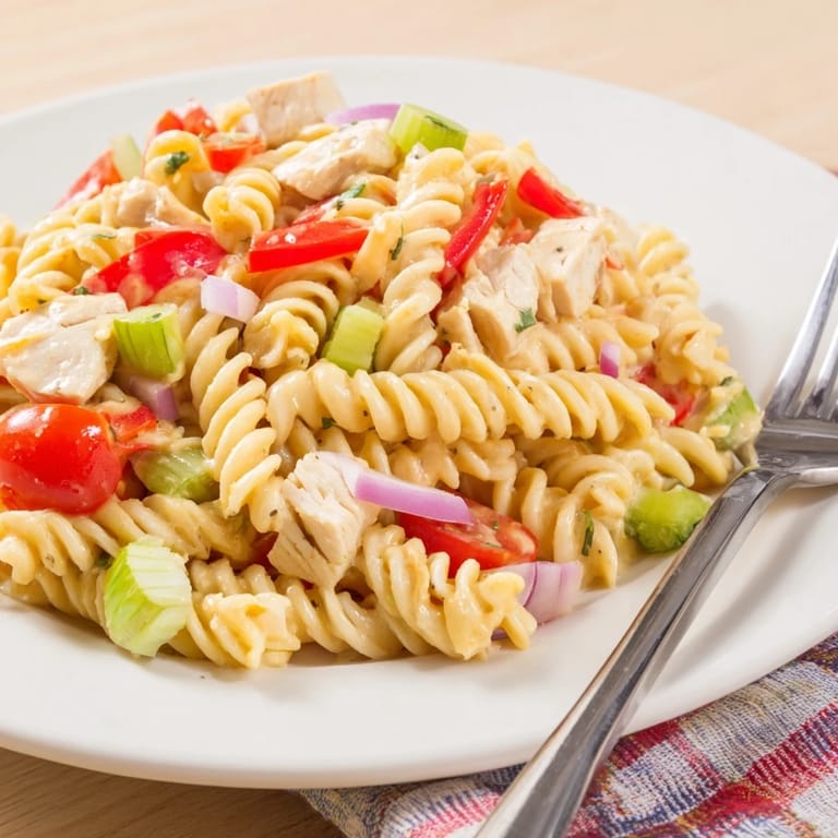 The prepared salad keeps well for up to 2 hours when chilled, allowing flavors to meld. If storing longer, keep dressing separate and add just before serving to prevent the pasta from becoming soggy.